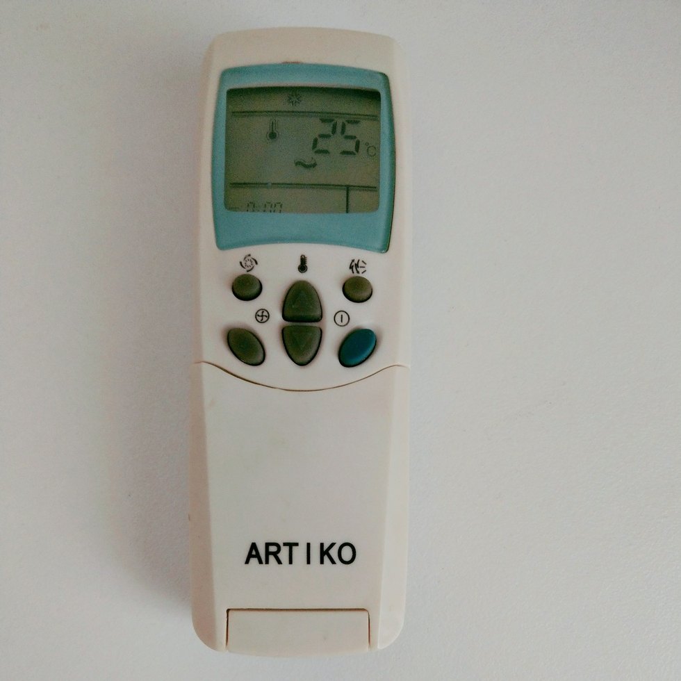 ARTIKO markalı dijital termometre kumandası, sıcaklık göstergeli ve açık renkli tasarıma sahip. ️