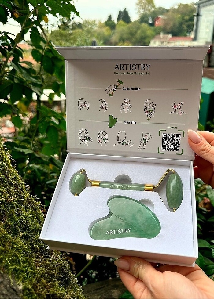 Başlıca Özellikleri Artistry™ Yüz ve Vücut için Masaj Seti - Bu set, bir Yeşim Taşı Roller Masaj Aleti ve bir doğal kuvarsit yeşim taşından yapılmış Gua Sha içerir. Bu vazgeçilmez güzellik araçları, cilde masaj yaparak lenf akışını stimüle etmek ve kan dolaşımının bölgesel olarak desteklenmesine yardımcı olmak üzere kullanılabilir ve ayrıca Artistry™ ürünlerinin ve bileşenlerinin masaj işlemiyle daha iyi emilmesine de yardımcı olabilir. Aynı zamanda, uzun bir günün sonunda rahatlamak, kendinize zaman ayırmak ve sabah cildinizi canlandırmak için de harikadır. Cilt bakımı ürünleri ve Artistry™ Yüz ve Vücut için Masaj Setinin ek desteğiyle, dışarıdan uygulanan günlük temel adımları kapsayan, yüz ve vücut için temel nemlendirici cilt bakımı ihtiyaçlarının karşılanmasında son nokta.