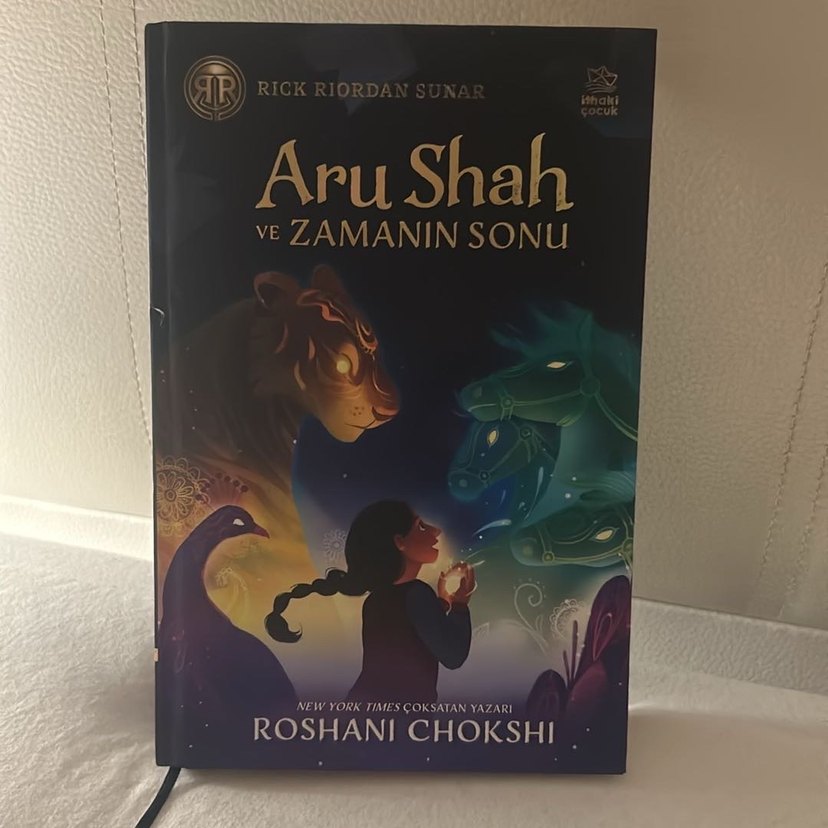 Roshani Chokshi'nin yazdığı, Rick Riordan'ın sunduğu Aru Shah ve Zamanın Sonu adlı hikaye kitabı, mitolojik maceralarla dolu. kalın kapak. yeni gibi