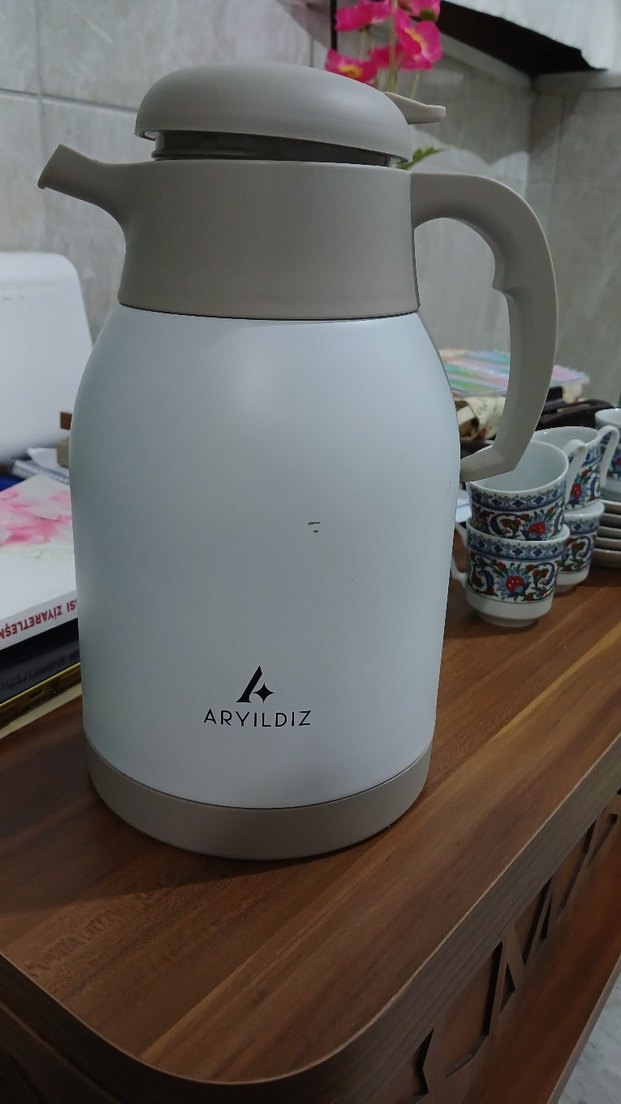 Aryıldız marka beyaz gövde ve gri detaylı, kolay tutuşlu saplı termoslu çaydanlıktır. beş kere kullanmışımdır, lazım olmadığı için satıyorum. Darbe sonucu oluşan deformeleri koydum.