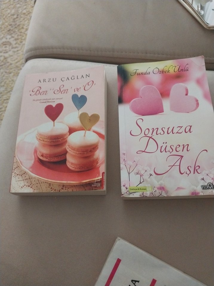 Arzu Çağlan ve Tunda Özbek Ünlü'nün aşk temalı romanları, kapaklarında makaron ve kalpler yer alıyor.