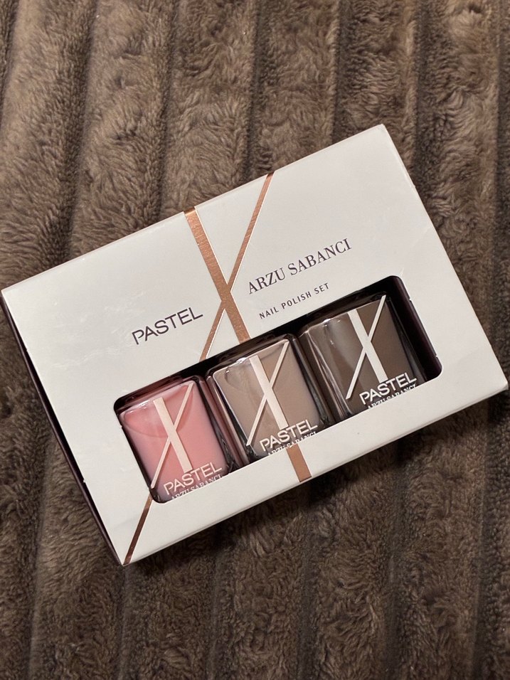 Arzu Sabancı'nın pastel tonlarda, yumuşak bej ve pembe renklerden oluşan üçlü oje seti. Tırnaklarda pürüzsüz ve şık bir görünüm sağlar.