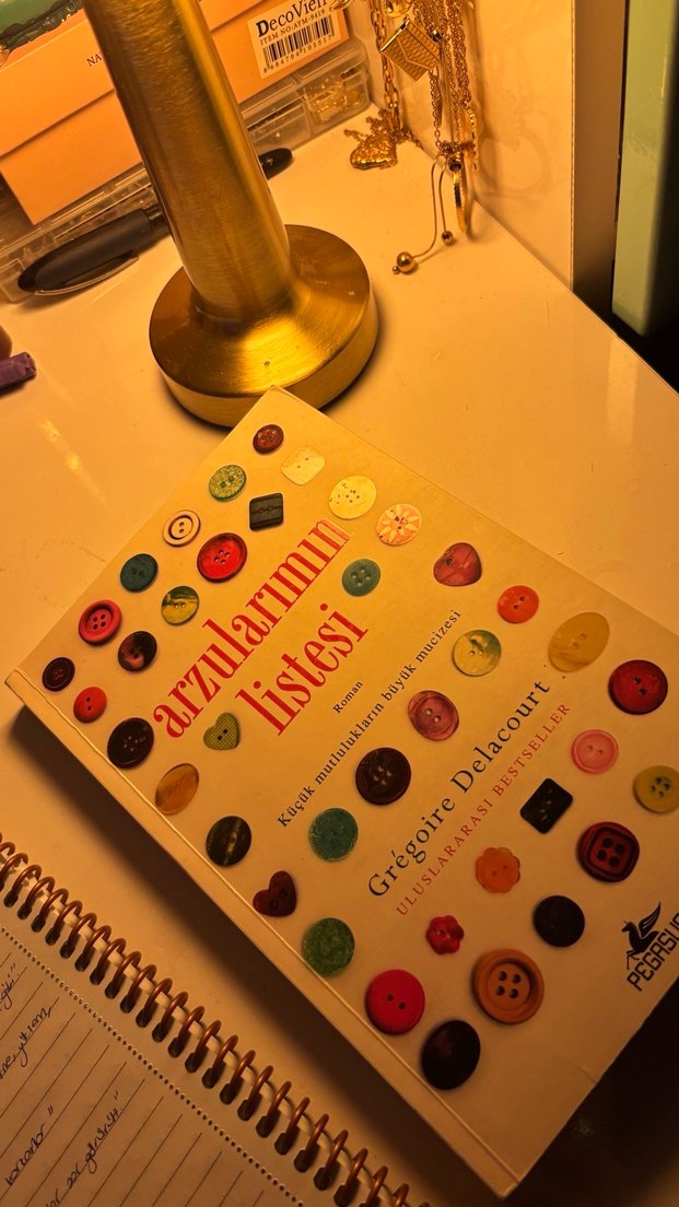 Grégoire Delacourt'un "Arzularımın Listesi" adlı kitabı, mutluluk ve arzuyu anlatan ilgi çekici bir eser. Kapakta renkli düğmeler yer alıyor.