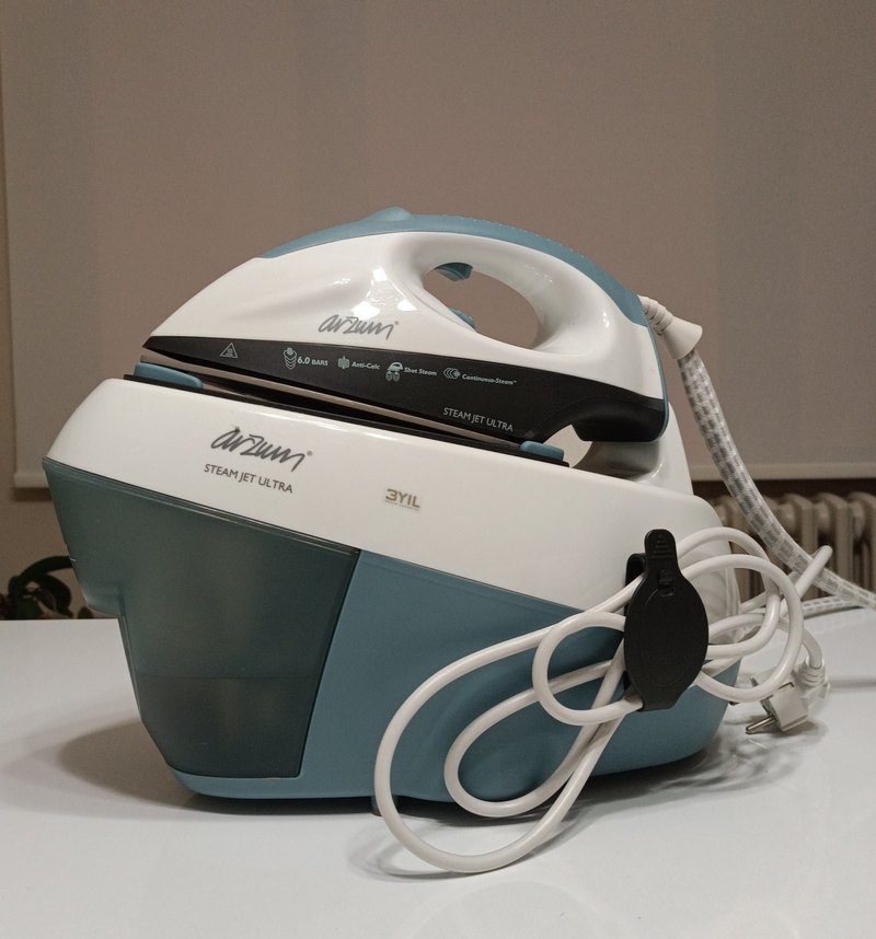 Arzum beyaz gri buharlı ütü, geniş su haznesi ve kolay kullanım için çıkarılabilir tasarıma sahiptir. 3 yıl garanti içerir. ⚙️