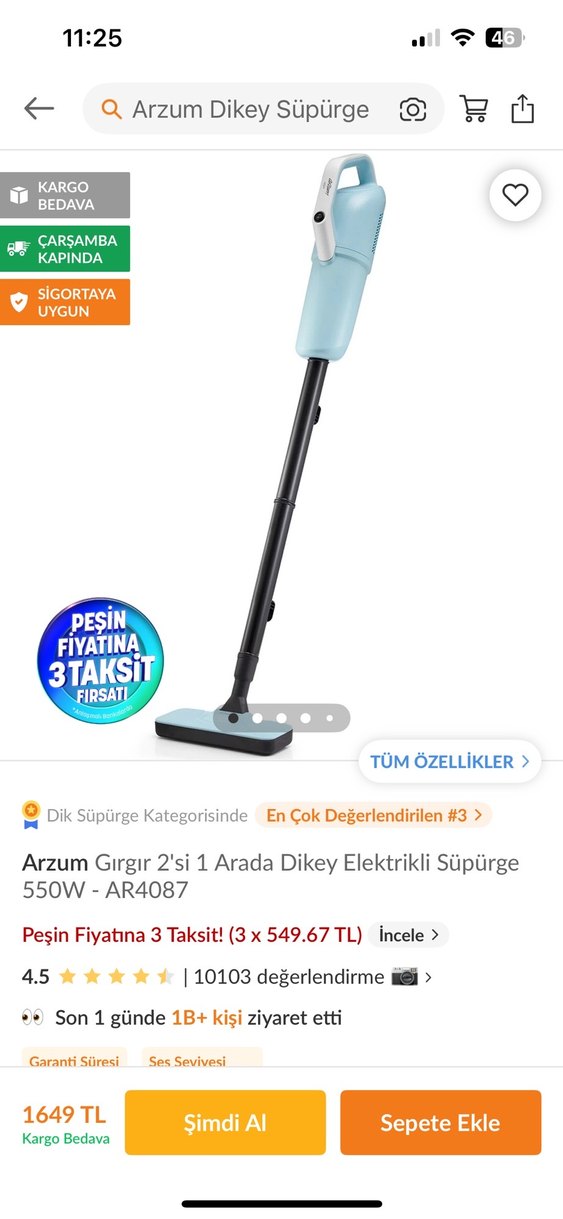 Pastel mavi renkli, 550W gücünde Arzum Gırgır 2'si 1 Arada dikey elektrikli süpürge. Yedi ay önce alındı sadece çalışıyormu diye denendi bir kereliğine hala kutusunda duruyor sadece kutusu biraz hasar görmüş şu anki fiyatını da görüyorsunuz sıfır gibi bir ürün