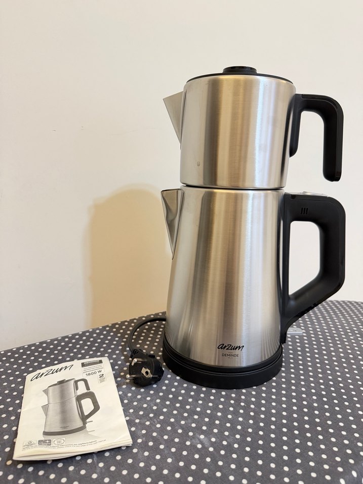 Gri renkte, siyah kulplu paslanmaz çelik Arzum çay makinesi ve kullanım kılavuzu içerir. ☕ 10 ay kadar daha garanti süresi var 2025 Ocak ayında alındı, alınmasının ertesi gün düştü ve su kaynatma kısmı görseldeki gibi yamuldu, garanti karşılamaz dediler o sebeple yenisini aldım, bir kere su kaynattım içinde o da çalıştığını kontrol etmek içindi, bu nedenle içinde su lekesi kalmış, ofis dükkan yazlık gibi alanlarda iş görür gibi nasıl isterseniz şu an normal fiyatı 3300₺