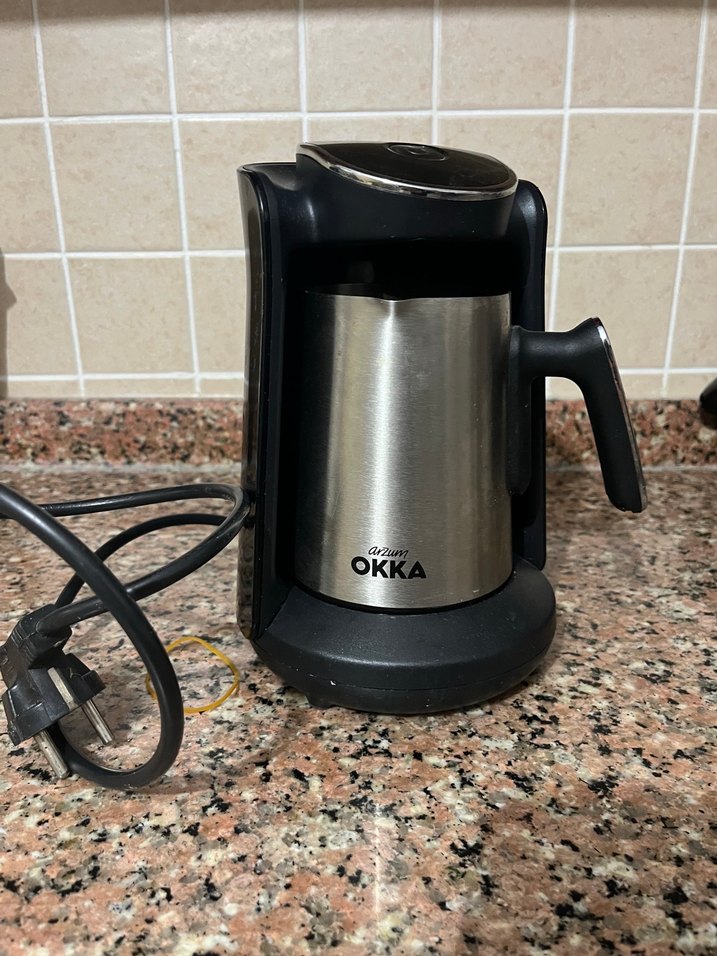 Gri OKKA kahve makinesi, paslanmaz çelik gövde ve siyah tutacak. toplam 3 kere kullanıldı çok memnundum fakat daha iyisi hediye geldiği için bunu satıyorum kusursuz çalışmaktadır defosu yok