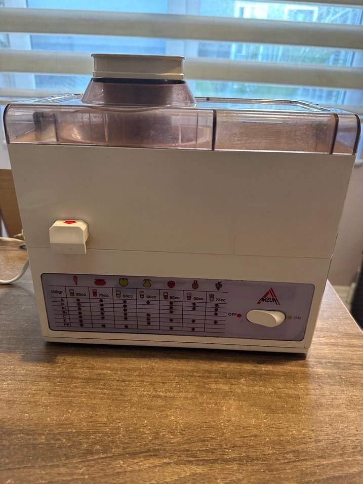 Tek tuş ayarı ve şeffaf üst kapağı olan beyaz meyve sıkacağı. Basit açma/kapama düğmesi ve kompakt tasarıma sahiptir. Görüldüğü gibidir, çalışıyor. Ok kısmında akıyor. Parçaları sağlam