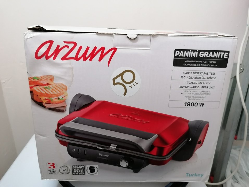 Arzum kırmızı tost makinesi, dört plakalı, 180 derece açılabilir ve yapışmaz yüzeye sahiptir. Kolay temizlenir.