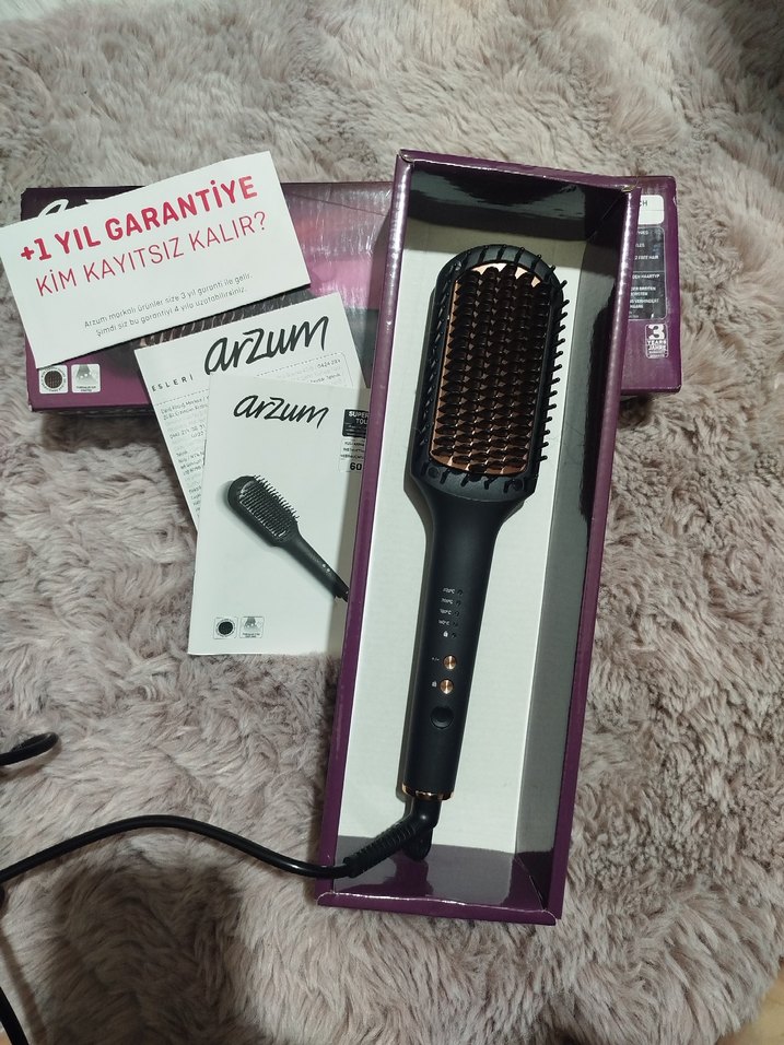 Arzum saç düzleştirici tarak fırça, kolay kullanım ve 1 yıl garanti ile birlikte gelir. Rahat tutuş ve ısı ayarlarıyla saçları düzleştirir. ✨