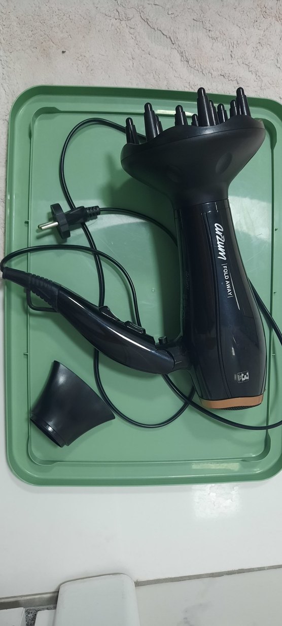 Uzun saplı siyah saç kurutma makinesi, iki aparatıyla farklı şekillendirme seçenekleri sunar.