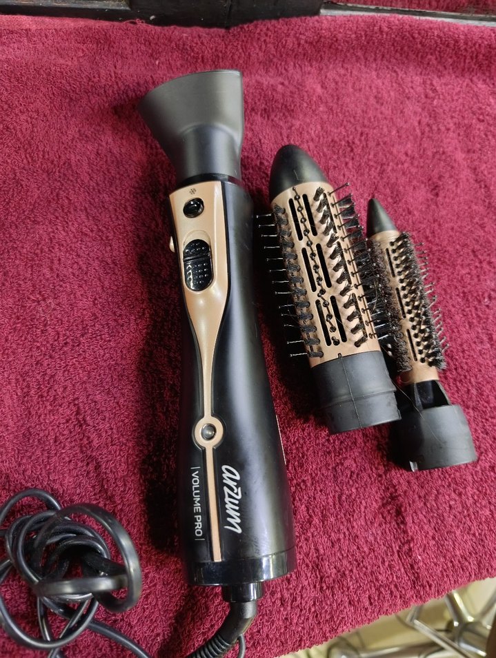 Arzum saç şekillendirici seti, ana ünite ve iki değiştirilebilir fırça başlığı içerir. Ayarlanabilir özelliklerle çok yönlü kullanım sağlar. ♀️