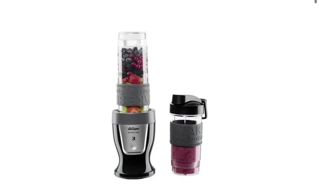 Arzum kişisel blender, siyah ve gri renklerde, kompakt tasarıma sahip. İki adet karıştırma kabı ve taşınabilir kapak içerir, smoothie hazırlamak için uygundur. 12 Mayıs 2025 Tarihinde media marktan alınmıştır az kullanıldı.