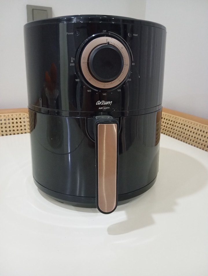 Arzum fritöz, kahverengi tutma yeri ve ayarlanabilir sıcaklık kontrolüyle koyu renk dış yüzeye sahiptir Bir kez kullanıldı