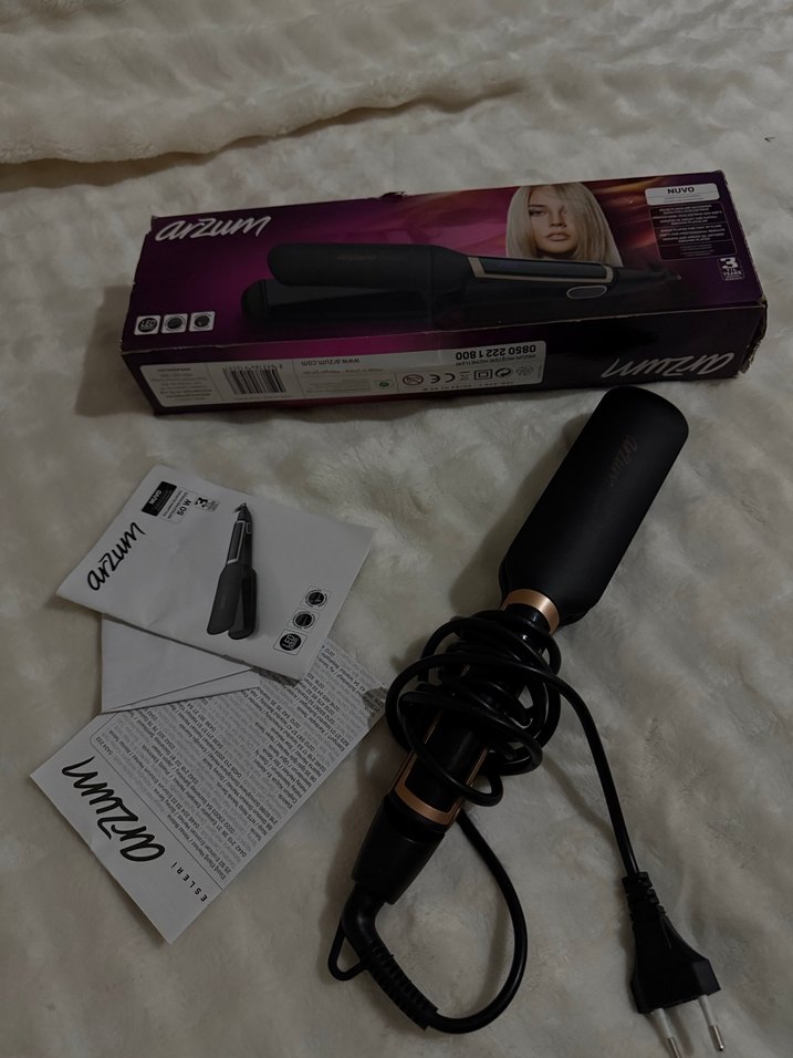 Arzum siyah saç düzleştirici, koyu renkte ve saçları düzleştirmek için etkili bir tasarıma sahiptir. Kullanımı kolay kontrol düğmeleri bulunur. ✨