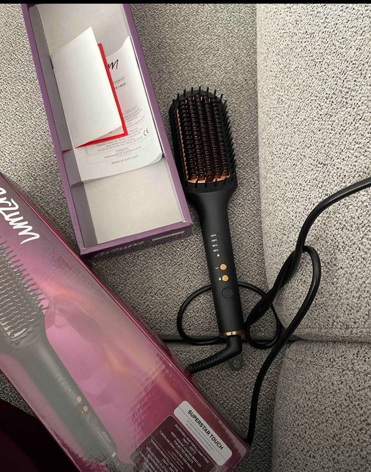 Siyah renkli, kullanımı kolay kontrolleri olan saç düzleştirici fırça, şık tasarıma sahiptir.