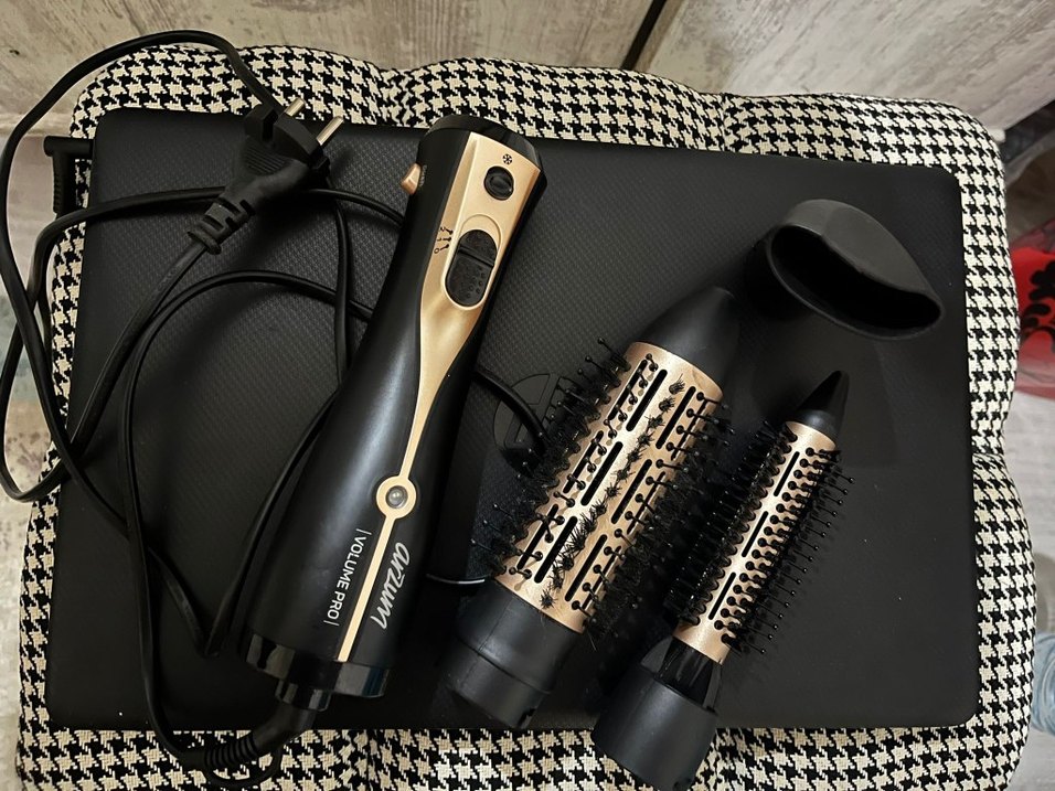Kontrol düğmeli siyah saç şekillendirici sapı ve iki çıkarılabilir yuvarlak fırça başlığından oluşan set. ♀️ Hiçbir arızası yoktur.