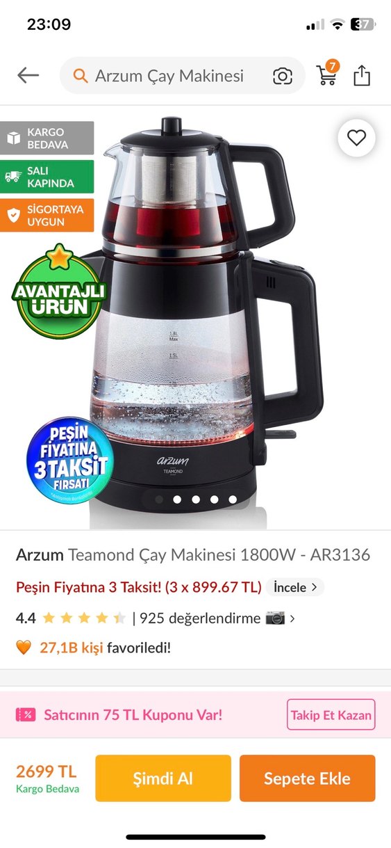 Arzum Teamond 1800W gücünde, siyah renkli çay makinesi. Cam demliği ve su ısıtıcısı ile su seviyesi göstergesi bulunur. 1 ay kullandım az kullanıldı hediye bi adet daha geldi çaycı o yüzden sarıcam uygun fiyat vericem kaçırmayın.almadan önce piyasa satış fiyatına bakmayı unutmayın