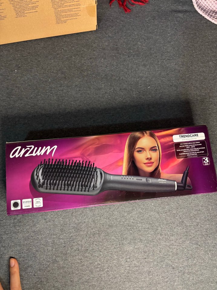 Arzum Trendcare saç düzleştirici fırça, siyah renkte, koyu ve şık tasarıma sahiptir. Saçları kolayca düzleştirip tarar. Herhangi bir sorunu yok