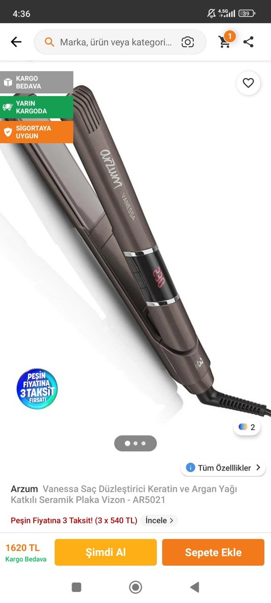 Arzum Vanessa kahverengi saç düzleştirici, dijital sıcaklık göstergesi ve esnek kabloya sahiptir. Sigortaya uygundur ve keratin ile argan yağı içerir. ♀️ çok az kullanıldı. kullanım sonrası görselde mevcut