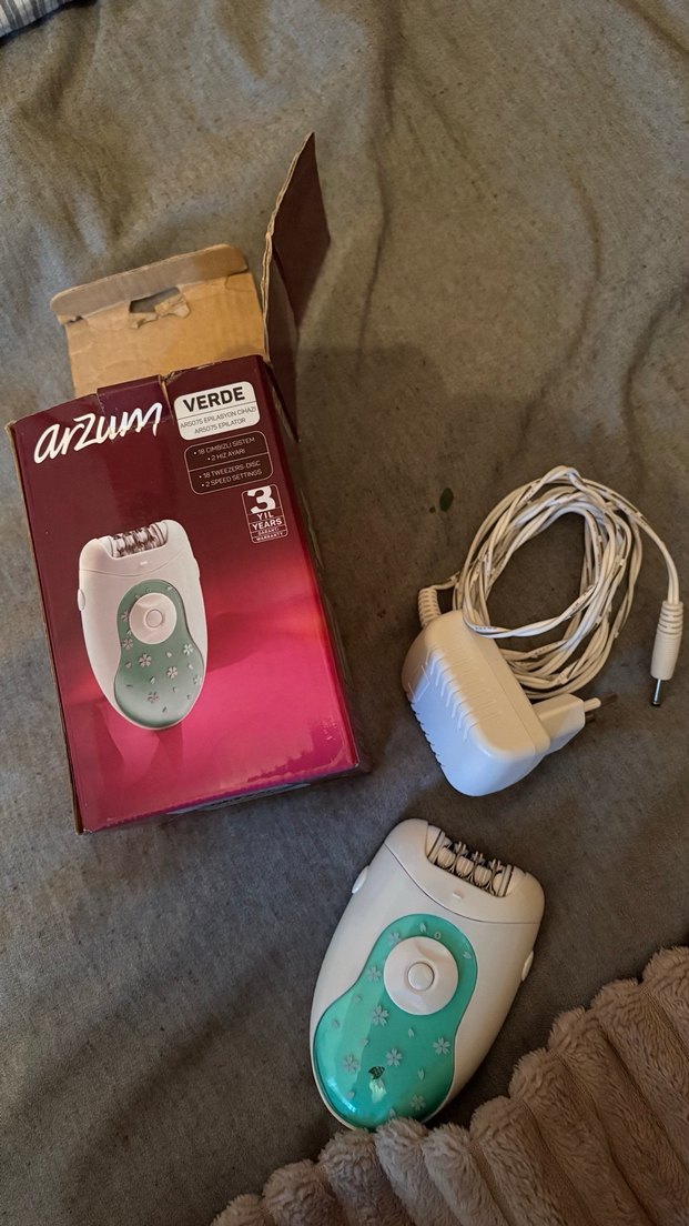 Arzum Verde gri ve beyaz renkli epilatör, etkili tüy alma için çoklu cımbızlara sahiptir. Güç adaptörü ile birlikte ve 3 yıl garanti kapsamındadır. Az kullanildi sorunu yok