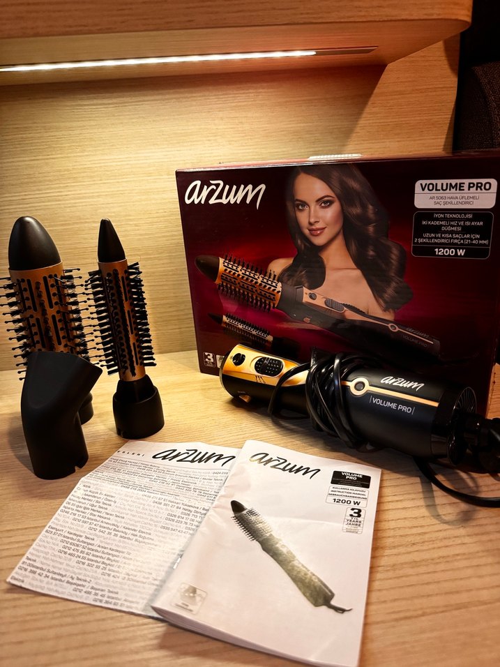 Arzum Volume Pro 1200W saç şekillendirici, farklı fırça başlıklarıyla çeşitli stiller yaratır. Siyah ve altın renk kombinasyonuyla kolay kullanım sağlar. Kullanım kılavuzu dahildir. Ürünü fırçasından anlaşıldığı üzere hiç kullanmadım aynı zamanda başka bir marka ürün hediye geldiği için.