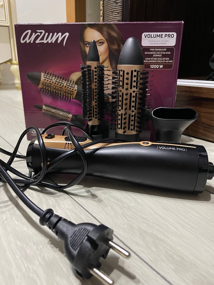 Arzum VolumePro saç şekillendirici, siyah renkte, çeşitli fırça başlıkları ve konsantratör başlığı ile 1200 watt gücünde çok yönlü kullanım sağlar. ♀️