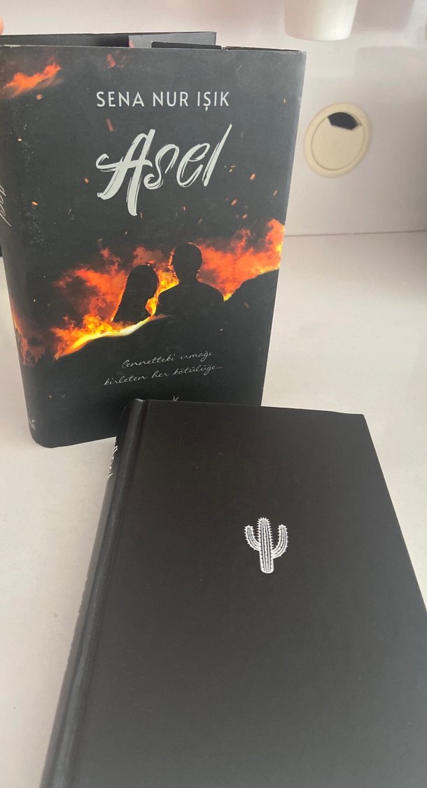 Sena Nur Işık'ın Asel adlı romanı, kaktüs figürlü siyah kapak ve alevler önünde iki figürlü dramatik sahneye sahip.