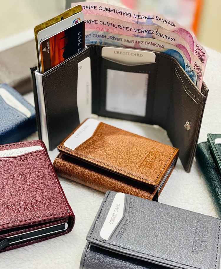 Kahverengi modern klasik erkek cüzdanı, kart ve nakit için bölmeler içerir. Üzerinde 'CREDIT CARD' yazan kısım vardır. Şık baskılı desene sahiptir. 34223