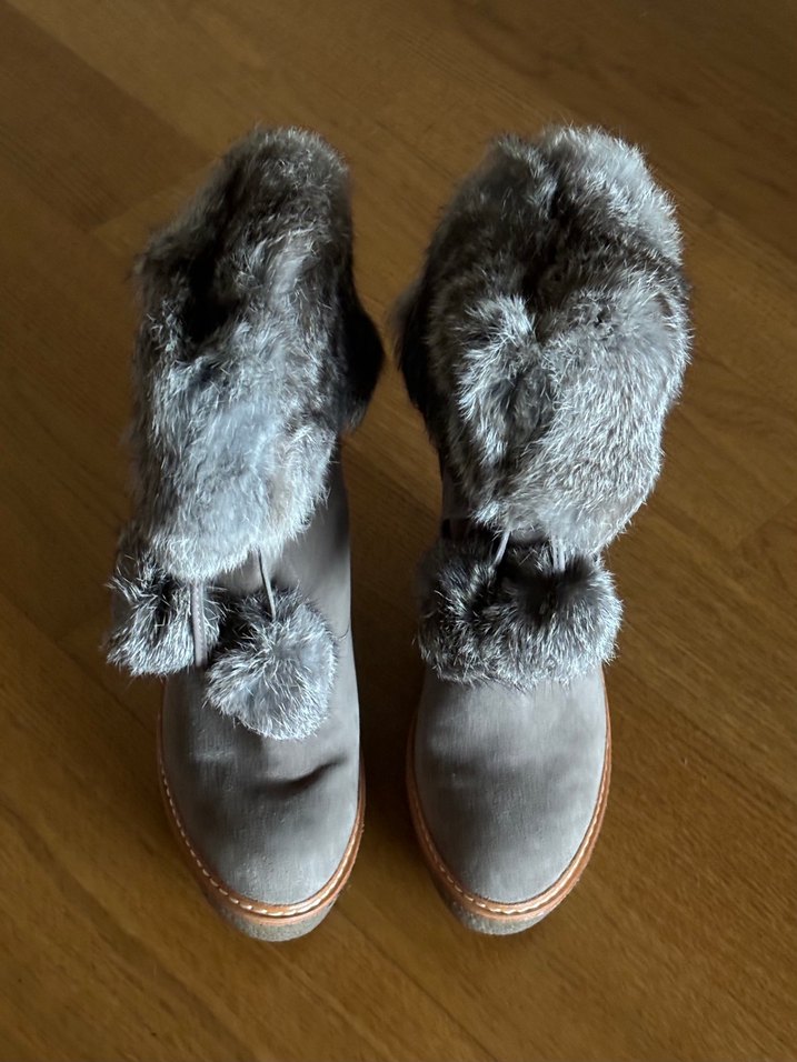 Ash vizon rengi süet dolgu topuklu bot, kürk detaylı bot. Günlük kullanım için rahat ve normcore tarzda.