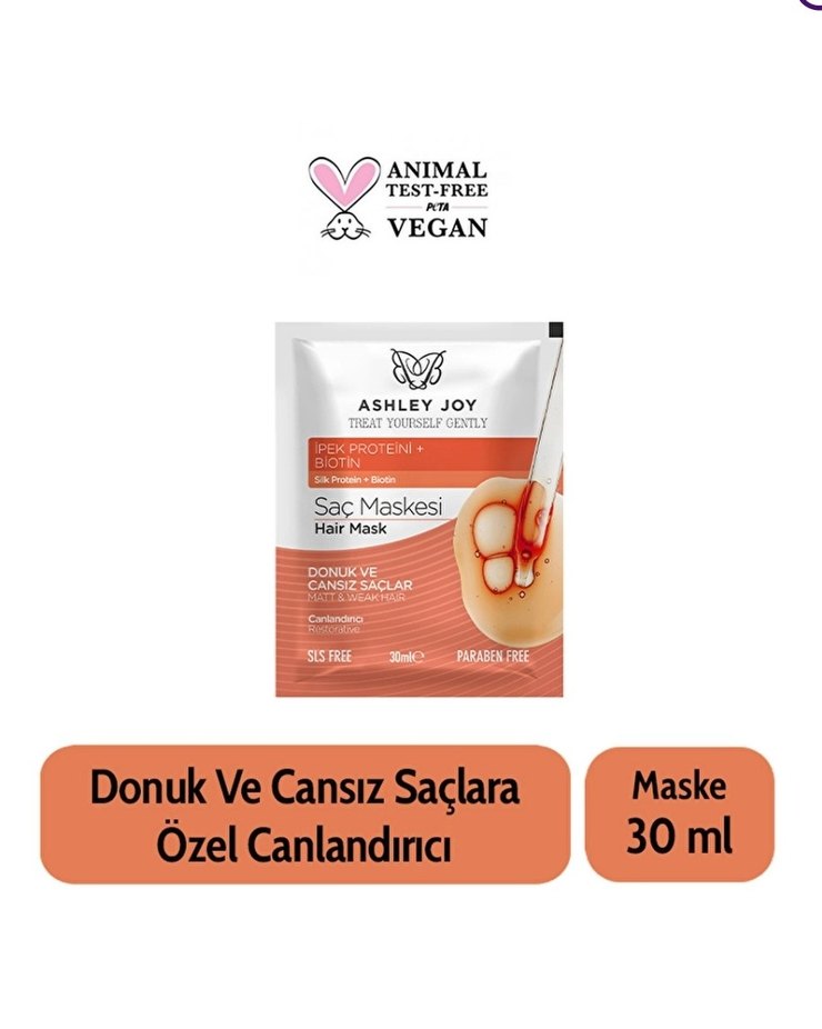 Ashley Joy saç maskesi, biotin ve ipek proteini ile donuk ve cansız saçları canlandırır. Vegan, test edilmemiş, paraben ve SLS içermez. 30 ml.