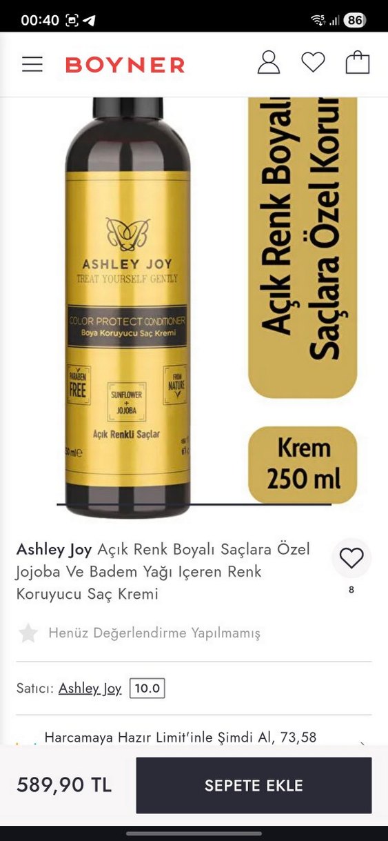 Ashley Joy açık renk boyalı saçlara özel, jojoba ve badem yağı içeren renk koruyucu saç kremi. Boyner'den alındı. Saç rengini korur ve yumuşatır. Açık renk saçlara özel. 2 fıs kullanıldı. Koruyucu ambalajı üzerinde açılmadı.