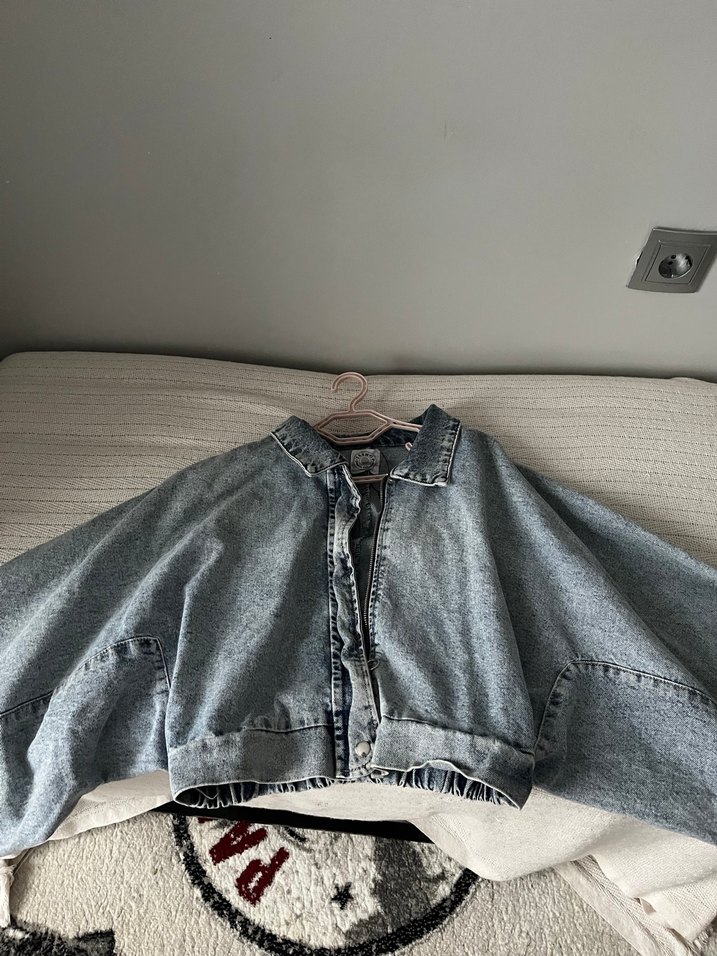 Bol kesim, uzun balon kollu kot ceket. Düğmeli ön, yüksek yakalı ve açık renkli batik desenli. Günlük rahat stil için uygun.2 kere giydim bana kısa olduğu için giyemedim.standart bedendir