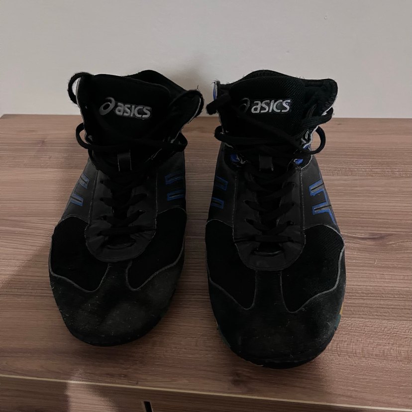 Siyah mavi alt tabanı renkli kaliteli az kullanılmış güreş ayakkabısı tek defosu ön tarafta küçük iki tane delik vardır kullanıma engel değildir zaten uyguna bırakıyorum şimdiden hayırlı olsun.