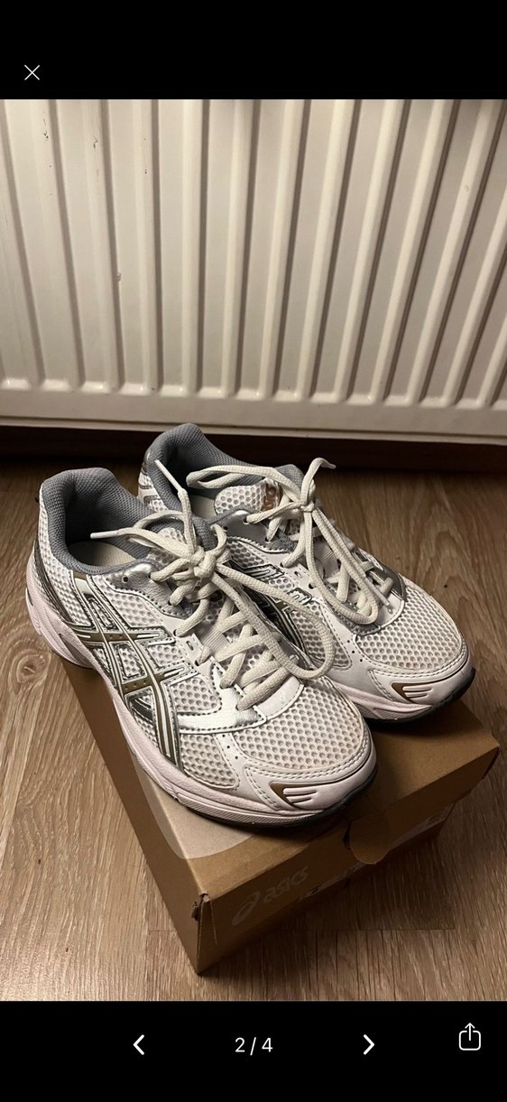 Beyaz Asics spor ayakkabılar, bağcıklı tasarıma sahip, nefes alabilir üst yüzey ve kauçuk taban ile sokak ve spor için uygundur.