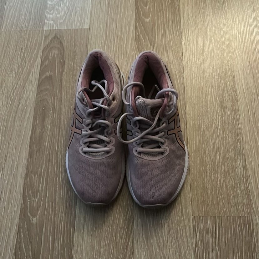 Pembe ve lila tonlarında, bağcıklı, kadın spor ayakkabısı. Gündelik kullanım için uygundur.
