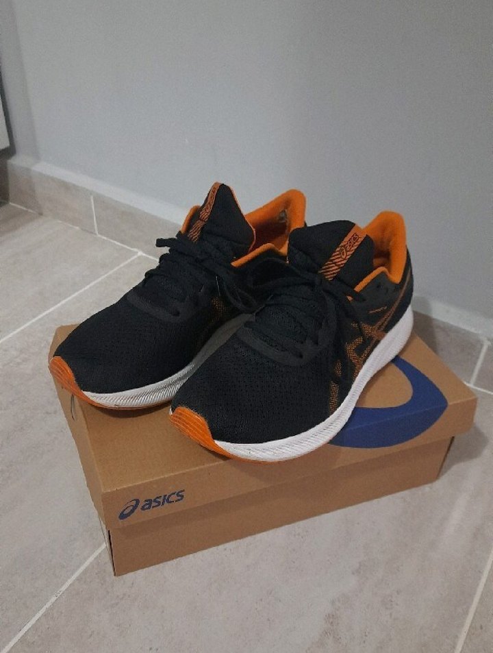 Asics Patriot 13 -orjinaL- topuk iç astarı sürtünmeden kaynakLı aşınmış. haricinde hiçbir sıkıntısı yoktur. Oasics erkek spor ayakkabı, turuncu detaylı koyu renk baskılı tasarıma ve cırt cırtlı bağlama sistemine sahiptir. Kauçuk tabanlıdır, spor ve günlük kullanım için uygundur.