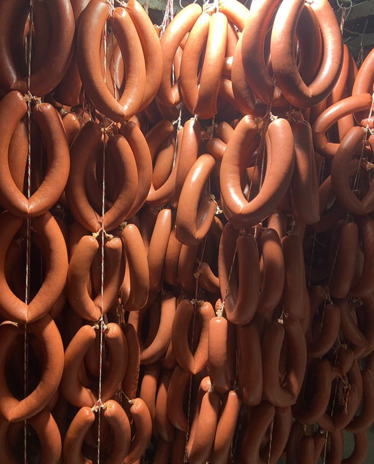 Sucuk halkaları sırayla asılmış, kullanıma hazır. kilosu 300 TL