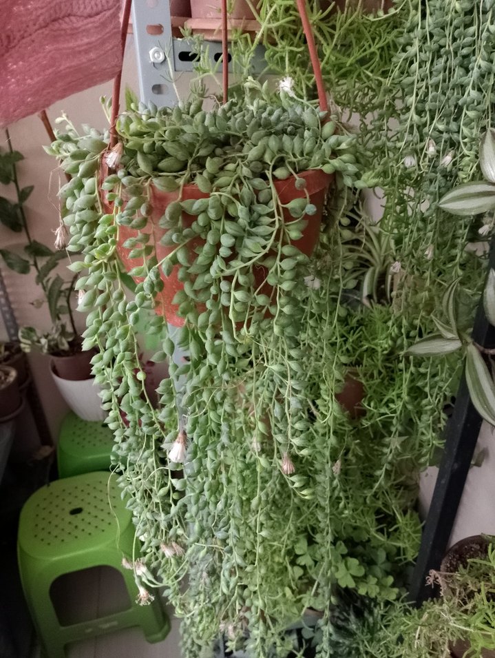 Uzun yeşil sarkık yapraklara sahip asılı dekoratif saksı bitkisi, iç mekanlara doğal bir hava katıyor.