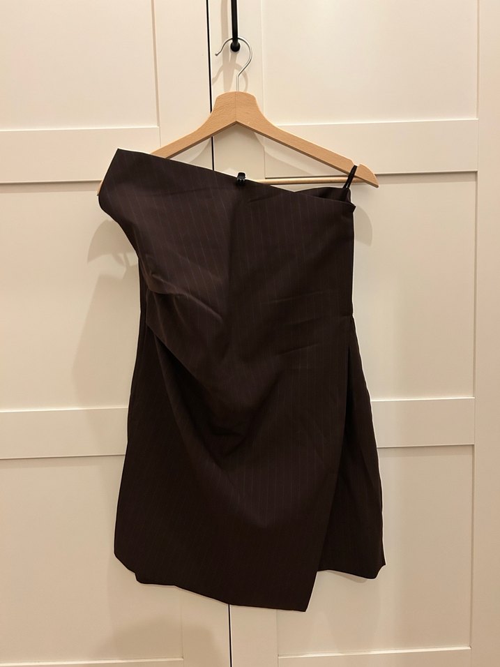 Kahverengi, asimetrik drapeli, straplez, şortlu,kolsuz ve vücuda oturan midi elbise, romantik akşamlar için ideal, Paris sokak modası tarzında.