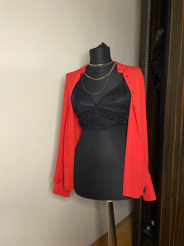 Koyu kırmızı, ipeksi kumaştan, gevşek kesimli kadın bluz. Askısız yaka, drapeli detaylar ve ince askılarla avangart, çağdaş tarzda günlük kullanım için uygun.