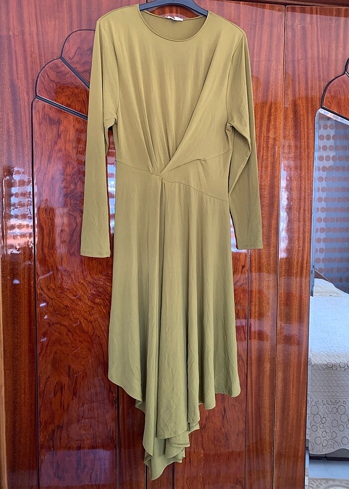 Kolunda omuz hizasında ufak bir delik var ya kolsuz olarak bir elbise olur ya da oralara apolet gibi bir şeyler dikilebilir çok şık tarz bir elbise biraz ince bir yapısı vardır omuz 42 kol boyu 61 kol altı arası 40 bel 34 etek en kısa tarafı 55 en uzun tarafı 88 boyu 125 cm