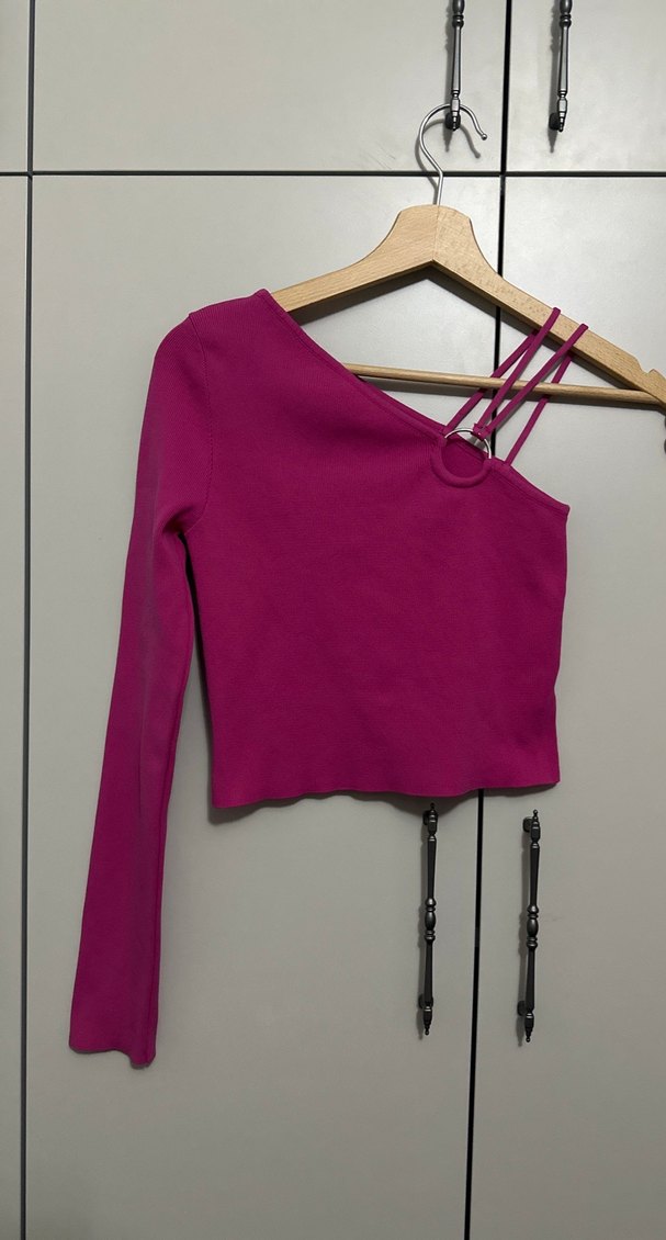 Koyu pembe, tek kollu ve askılı tokalı detaylara sahip, sentetik kumaştan yapılmış dar kesim crop top. Günlük sokak stili için uygundur.