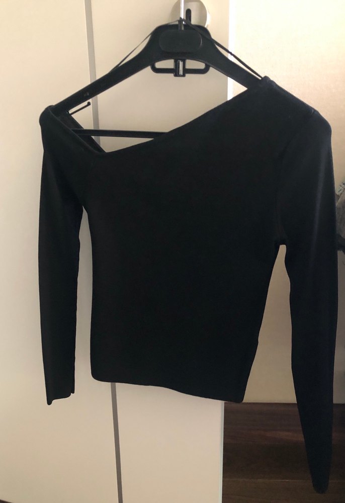 Omuz dekolteli asimetrik triko bluz