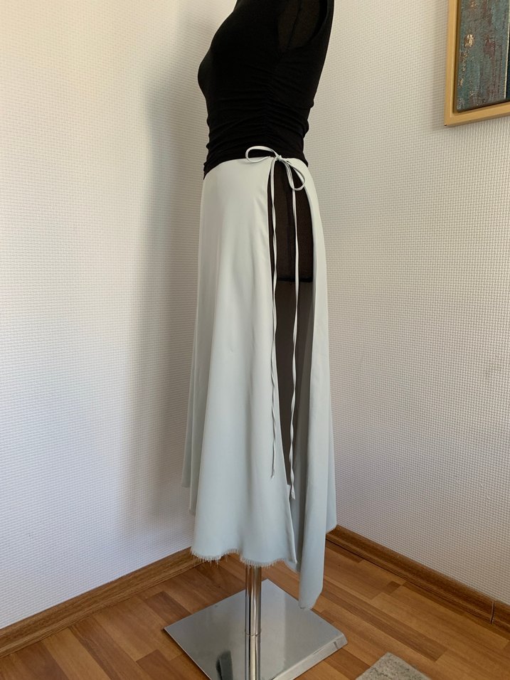 Üst üste etekle ya da tek başına giymek için Asimetrik dökümlü, iki tarafı da derin yırtmaçlı, belden bağlamalı, hiç kullanılmadı XS/S beden Tasarım