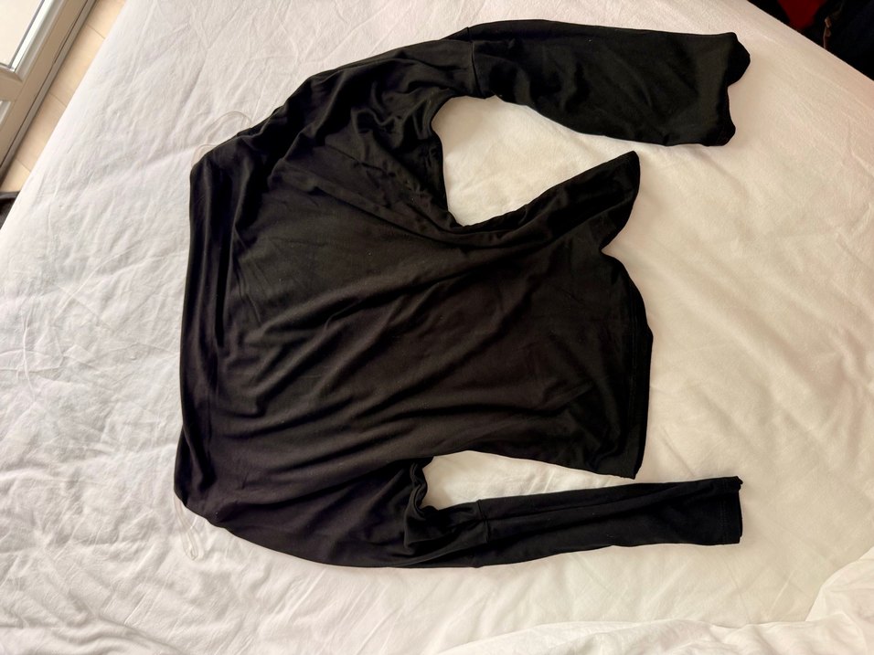 Siyah, ipeksi kumaştan, balıkçı yaka ve drapeli, uzun kollu, normal boyda, vücuda oturan bluz Minimalist gotik tarzda günlük kullanım için uygundur.