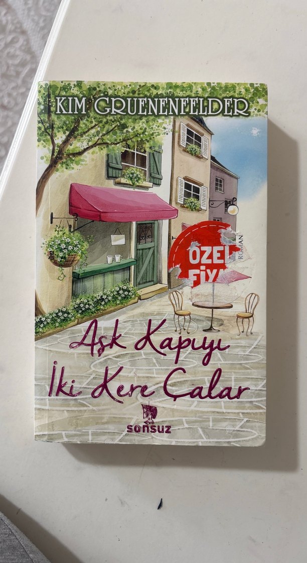 Kim Gruenenfelder'in 'Aşk Kapıyı İki Kere Çalar' adlı romanı, dışarıda masa ve sandalyelerin bulunduğu şirin bir kafe önünü gösteren sıcak ve davetkar bir kapak tasarımına sahip.