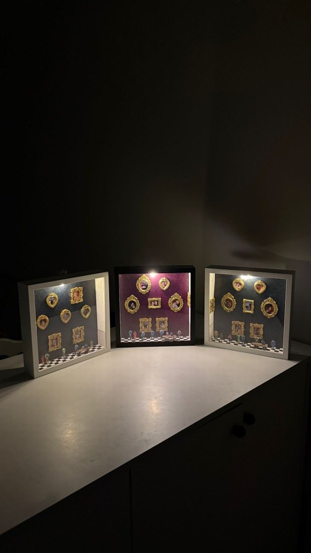 Üçlü altın renkli koyu çerçeve seti, içlerinde çeşitli küçük dekoratif parçalar bulunur, yumuşak ışık altında sergileniyor. ️komple yapılı halidir.