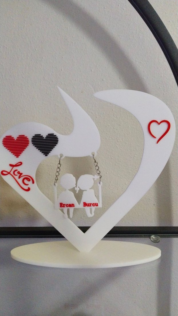 Ercan ve Burcu isimli çift figürlerinin sallandığı, kırmızı ve siyah kalpler ve 'Love' yazısı bulunan beyaz kalp figürlü biblo. ❤️isme özel yapilmaktadir