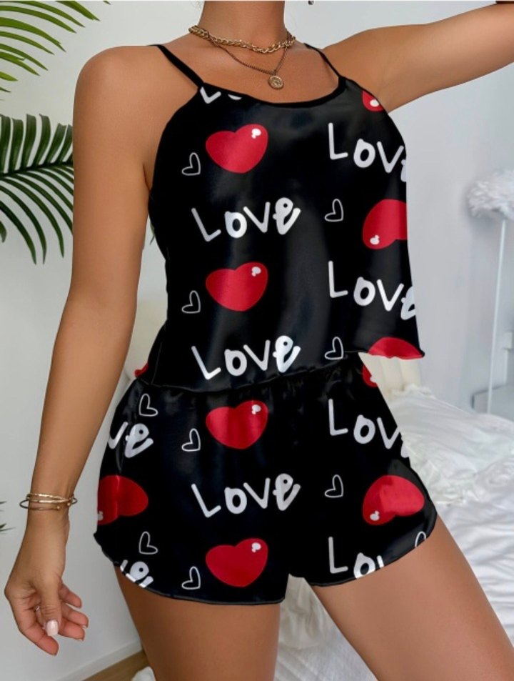Aşk Temalı Kalp Desenli Siyah Saten Şortlu Gecelik Takım